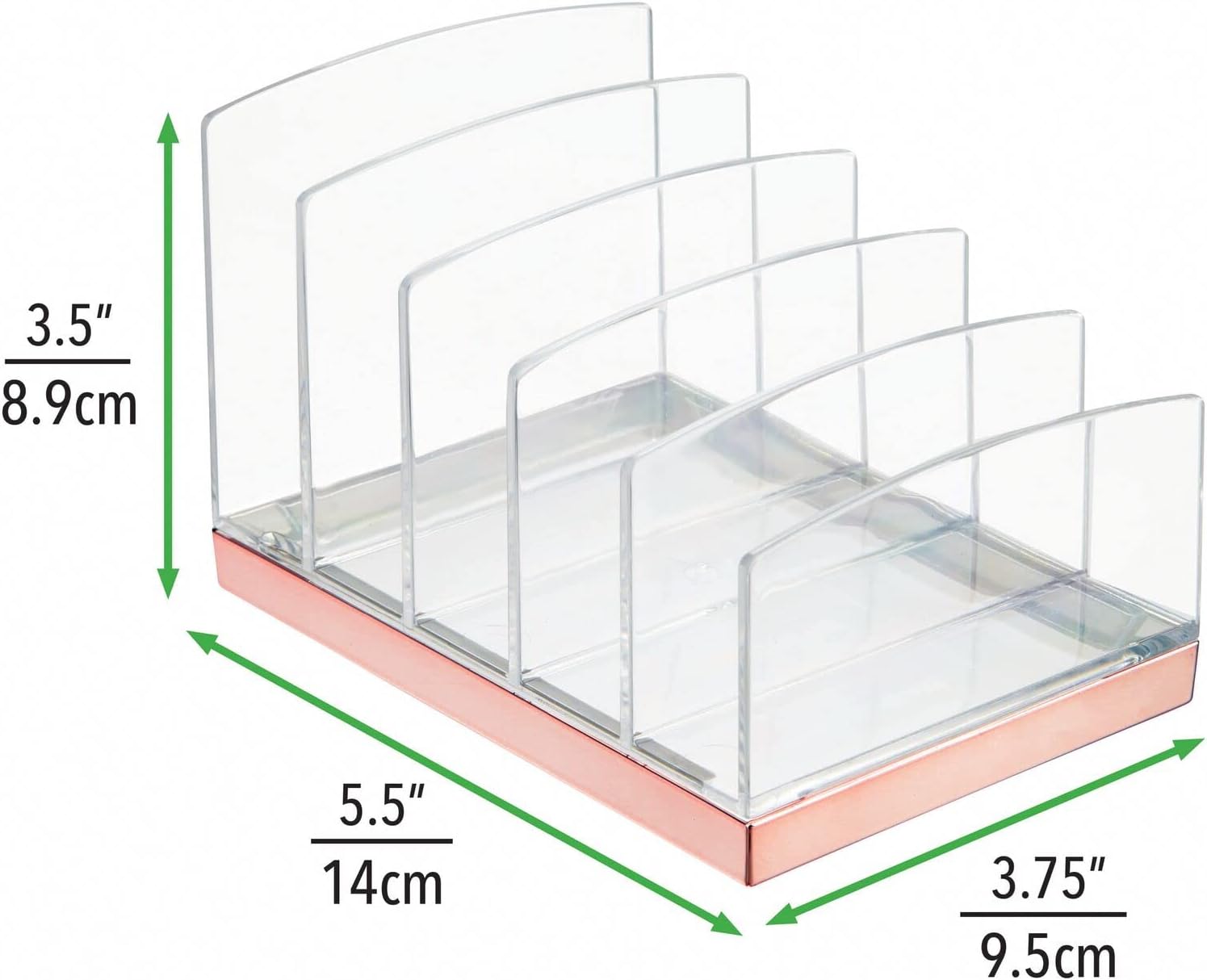 5 COMPARTMENTS: Countertops stay clean and clutter-free with this compact cosmetic organizer with 5 separate storage slots; Store your daily go-to cosmetics vertically and keep them organized and easy to find to make your morning routine effortless; The dividers feature different heights to help you arrange your cosmetics by size and make grabbing what you need quick and convenient