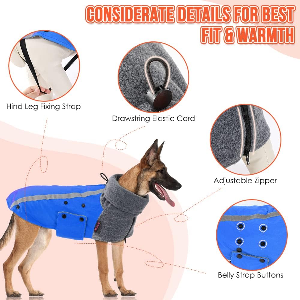 SlowTon Winter Dog Coat, Warm Polar Fleece Lining Doggie Outdoor Jacket with Turtleneck Scarf Reflective Stripe Adjustable Waterproof Windproof Puppy Vest Soft Pet Outfits (M+,Blue)