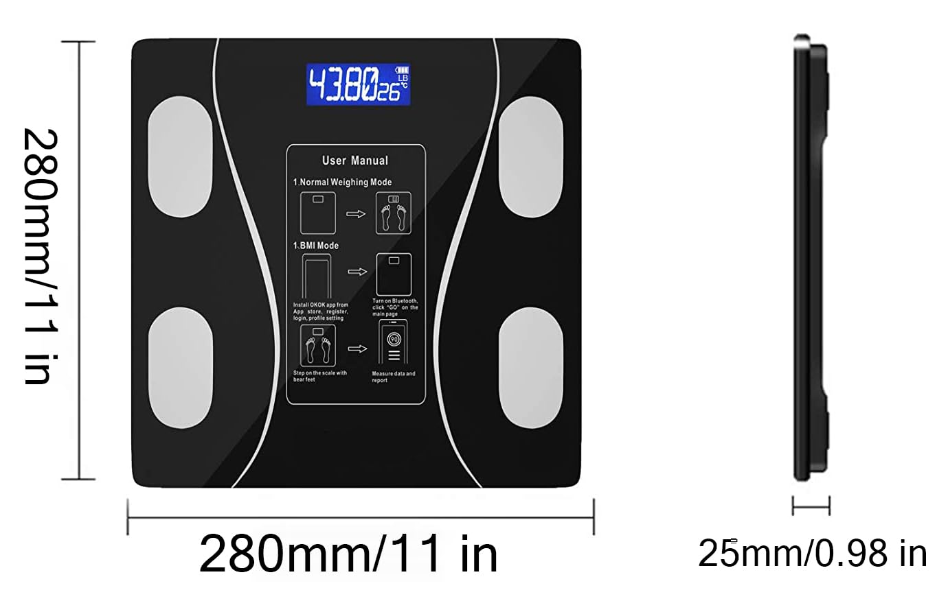 Material size and packaging: The electronic scale uses 0.6mm high-strength tempered glass, and the Bluetooth electronic scale size is 11X11nch X1inch. LCD high-definition display, day and night, clear readings, upgraded configuration, can measure indoor temperature.